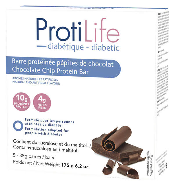 La barre pépites de chocolat de ProtiLife est là pour simplifier la vie des diabétiques! Spécialement conçue pour vous, cette barre sans sucre est votre collation idéale. Faciles à emporter, savoureuses, et regorgeant de bonnes protéines, ces barres sauront satisfaire vos fringales!