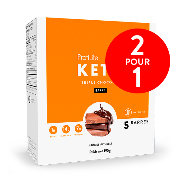Box of 5 bars. The Triple Chocolate Bar from ProtiLife Keto is scrumptious and will fit seamlessly into your ketogenic lifestyle. For chocolate lovers, this bar will be like a dream come true, with its mind-blowing taste! You have never eaten such a delicious Keto bar. Plus, we took the time to put together the right ingredients, including MCT fat, to offer you a quality product. SO DELICIOUS and decadent that you’ll be drooling!
