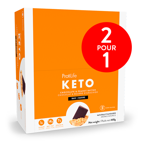 Box of 12 bars. ProtiLife Keto’s Chocolate & Peanut Butter Bar is scrumptious and will fit wonderfully into your ketogenic lifestyle. For peanut butter lovers, this bar is like a dream come true, with its mind-blowing taste and chocolate dip! You have never eaten such a delicious Keto bar. Plus, we took the time to put together the right ingredients, including MCT fat, to offer you a quality product. SO DELICIOUS and decadent that you’ll be drooling!