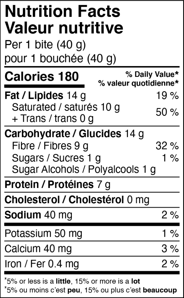 Délicieuse collation KETO parfaite. INGRÉDIENTS* : Mélange de beurres et de TCM [beurre de noix de cajou (noix de cajou, huile de tournesol), triglycérides à chaîne médium, beurre de cacao, huile de noix de coco en poudre (huile de noix de coco, maltodextrine, amidon de maïs modifié, bioxyde de silicium)], Enrobage à saveur de chocolat blanc (huile de palmiste fractionnée, isolat de protéines de lactosérum, inuline, érythritol, arômes naturels, lécithine de tournesol, sel, extrait de stévia), Polydextrose, Fibres de racine de chicorée, Isolat de protéines de lactosérum partiellement hydrolysé, Isolat de protéines de lait, Noix de Grenoble, Arômes naturels, Fibres solubles de maïs, Concentré de protéines de lait, Lécithine de tournesol, Extrait de feuilles de stévia biologique, Mélange de tocophérols. Contient : des noix de cajou, des noix de Grenoble et du lait. Peut contenir du blé, du soya, des oeufs, des arachides, des noix et sésame. *Nous tentons de nous assurer le plus possible que les informations nutritionnelles et les ingrédients inscrits sur le site Internet de ProtiLife sont exacts. Sachez que ces renseignements peuvent être modifiés à tout moment, donc veuillez consulter l’emballage de votre produit pour obtenir l’information exacte concernant celui-ci. Pour plus de détails, n’hésitez pas à communiquer avec notre équipe.